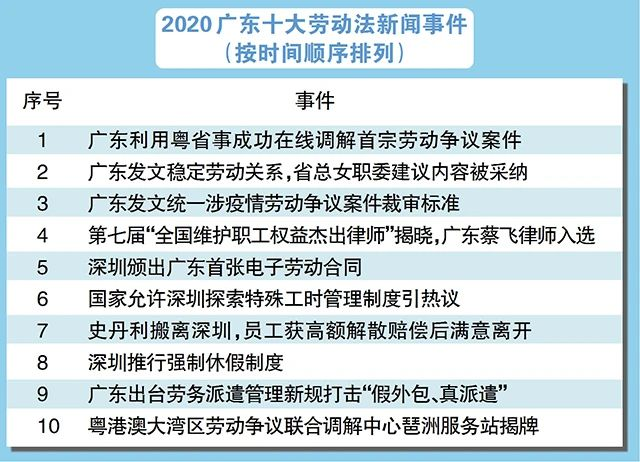 1月14日,由南方工报社联合广东省法学会劳动关系研究会举办的“2020广东十大劳动法新闻事件”评选结果揭晓。广东发文统一涉疫情劳动争议案件裁审标准、深圳颁出全省首张电子劳动合同等热点事件入选。