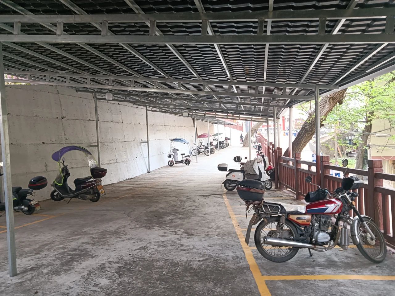 获悉二中校园场地有限,缺乏摩托车棚的实际情况,新丰县总工会想师生所想、急师生所急,平整土地、筑牢挡土墙、安装防护木栏杆、规划摩托车停车位、刷新标记标识,用树脂瓦、钢铁、水管等材料搭建。历时一个月,一个约200平方米、可停放约60辆摩托车的工会爱心摩托车停车棚终于完工,于2024年3月正式投入使用,受到广大师生的好评。