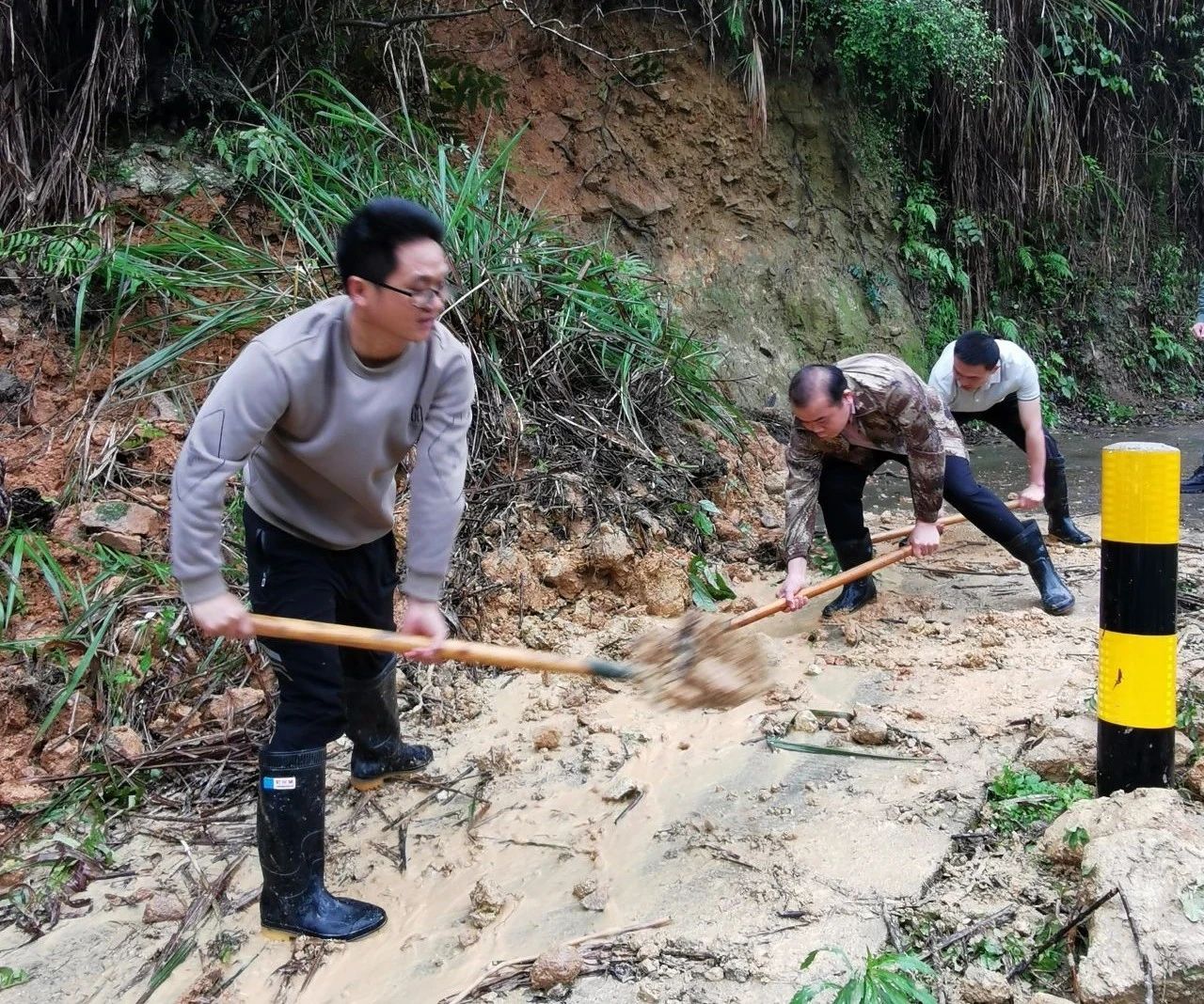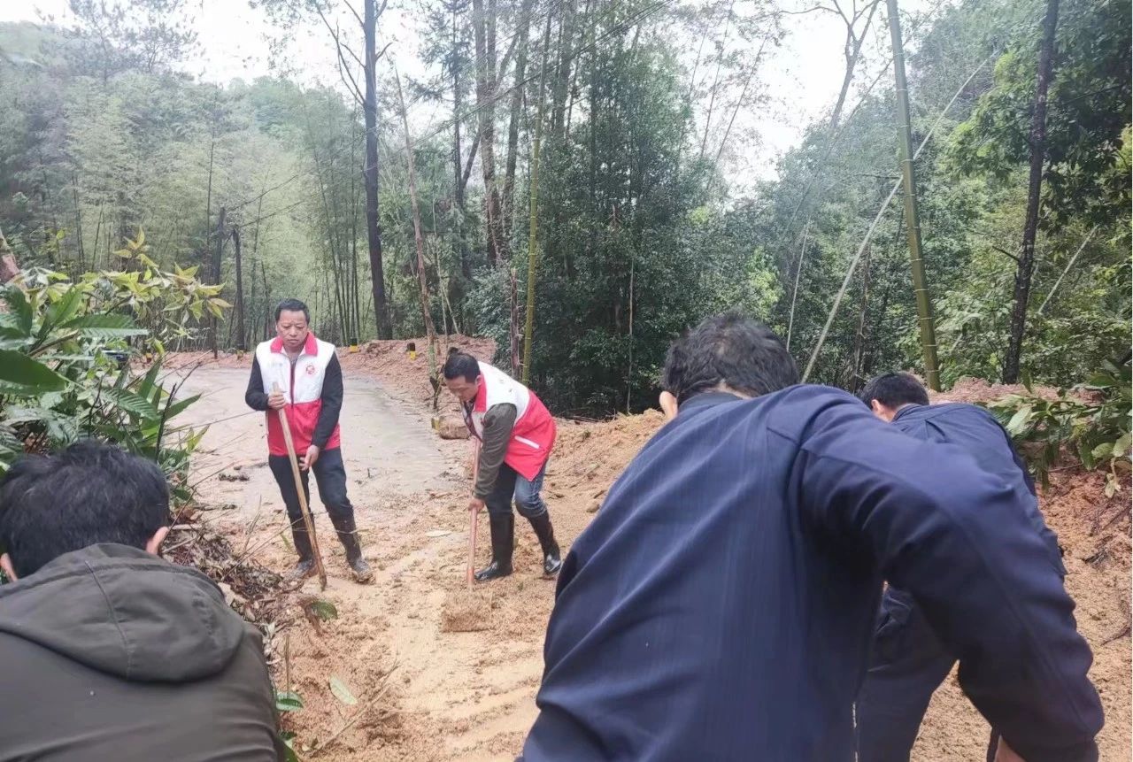 长江镇工会组织职工对长江镇陈欧塌方点道路进行疏通。