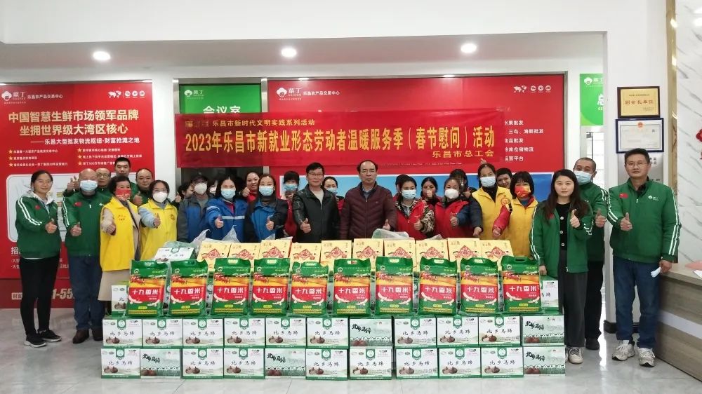 1月12日下午,乐昌市总工会到乐昌市菜丁电商物流园和市农产品供销批发市场开展新业态劳动者温暖服务季春节慰问活动。