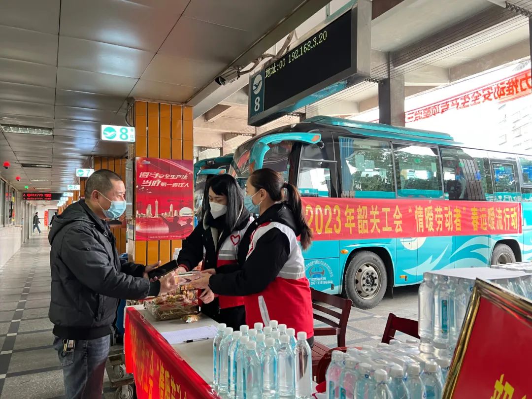 韶关市总工会、浈江区总工会联合韶关市粤运汽车运输有限公司,在韶关客运东站、韶关客运西站、韶关粤鸿客运站举办2023 年“情暖劳动者”韶关工会春运暖流行动,向返乡的异地务工人员派送食物、饮用水和乘车优惠券。