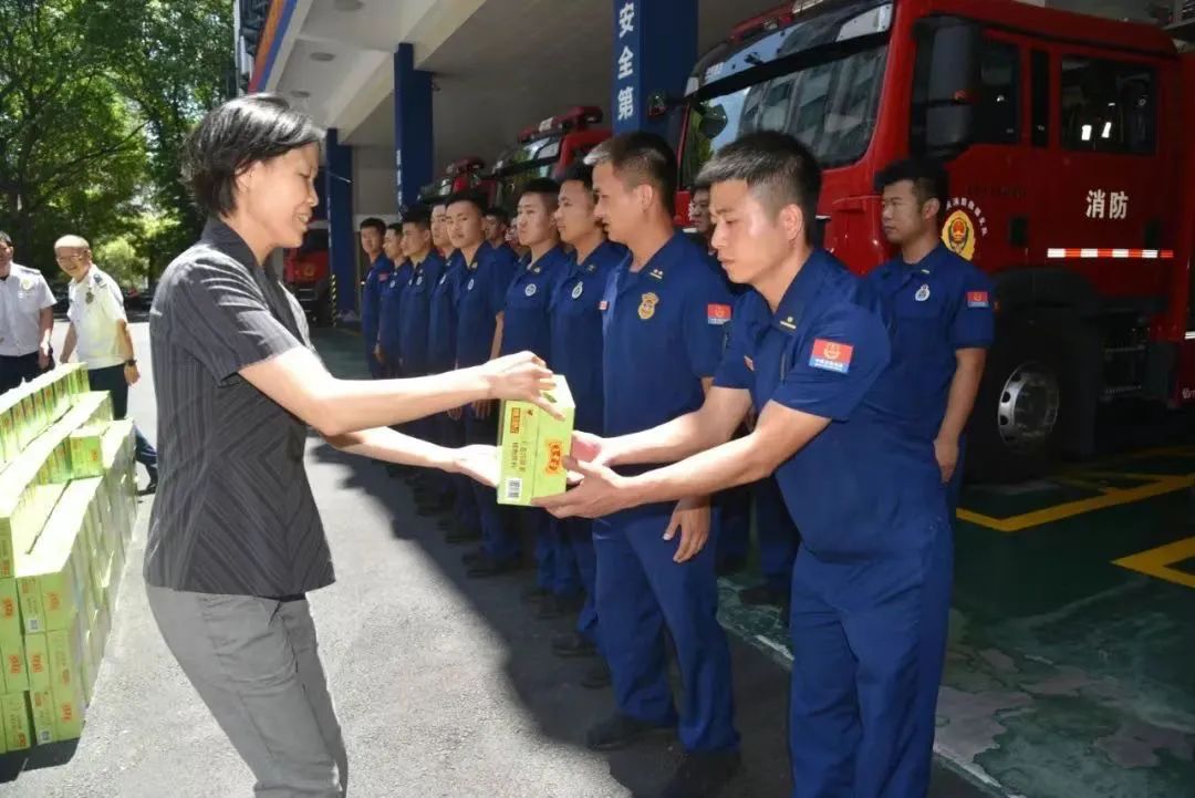 邓彩虹为消防队员送上清凉饮料。