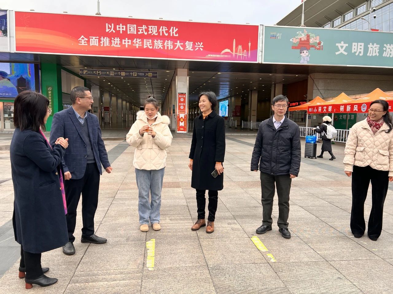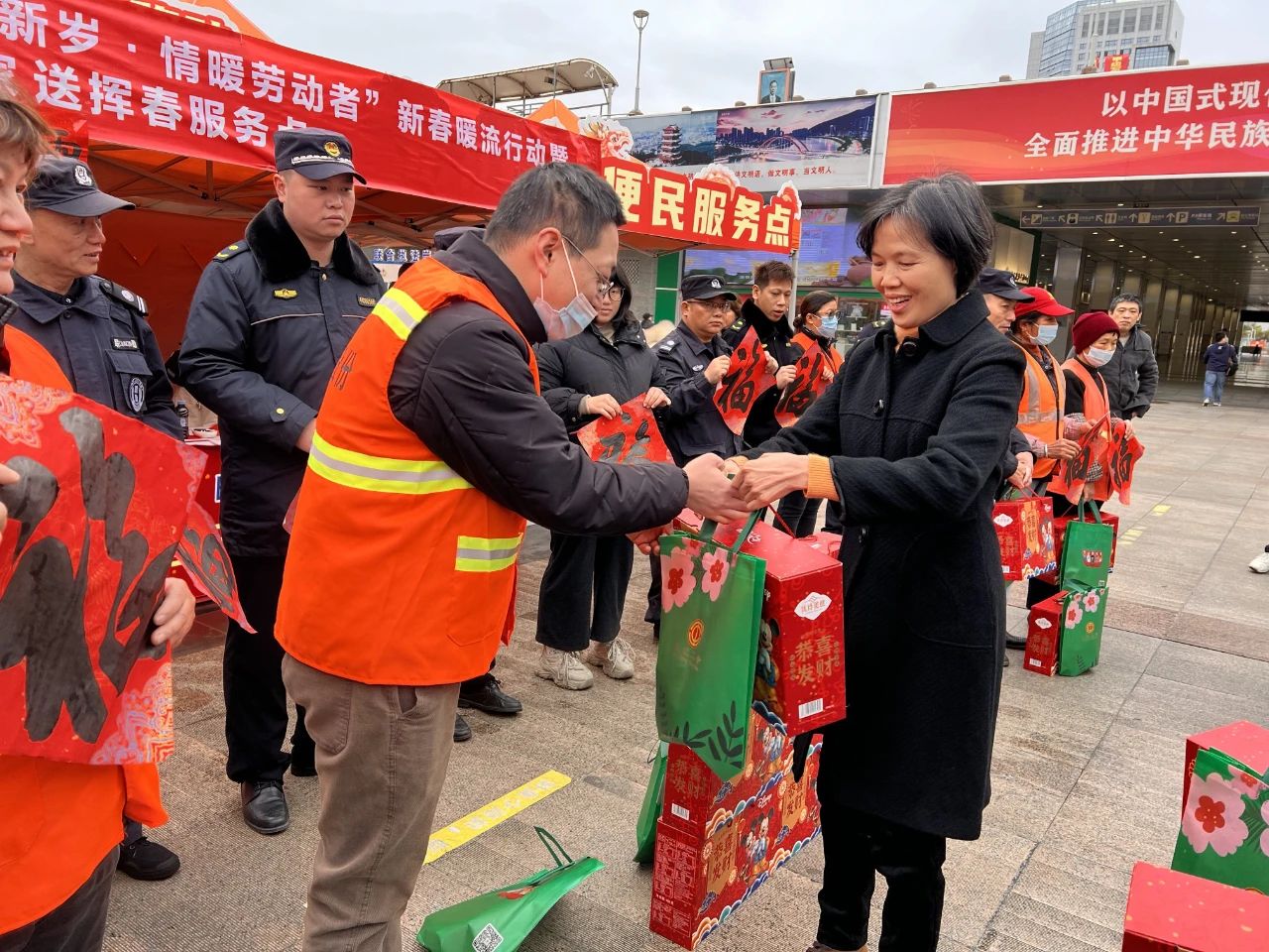 活动现场,邓彩虹向春运期间坚守在岗位的公安干警、环卫工人等送去新春大礼包,感谢他们在凛冽寒风中为返韶劳动者和旅客提供优质、贴心服务,并致以亲切问候和节日祝福。随后,邓彩虹一行来到“送万福,进万家”送春联服务点查看了解“送挥春”情况。