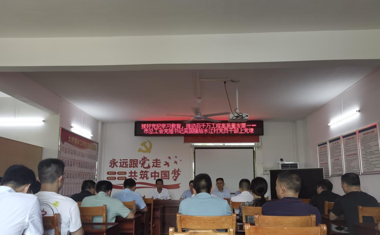 在水江村,市总工会党组书记、常务副主席、机关党委书记吴国强以“抓好党纪学习教育,推动百千万工程高质量发展”为主题,为市总工会机关事业单位党员干部和水江村党员上了一堂生动的专题党课,要求市总工会党员干部和村党组织党员深入学习领会习近平总书记关于全面加强党的纪律建设的重要论述,切实做到学纪、知纪、明纪、守纪,并进一步把纪律规矩转化为政治自觉、思想自觉、行动自觉,深入推进抓党建促“百千万工程”建设,为水江村加快建成宜居宜业宜游的和美乡村提供坚强组织保证。