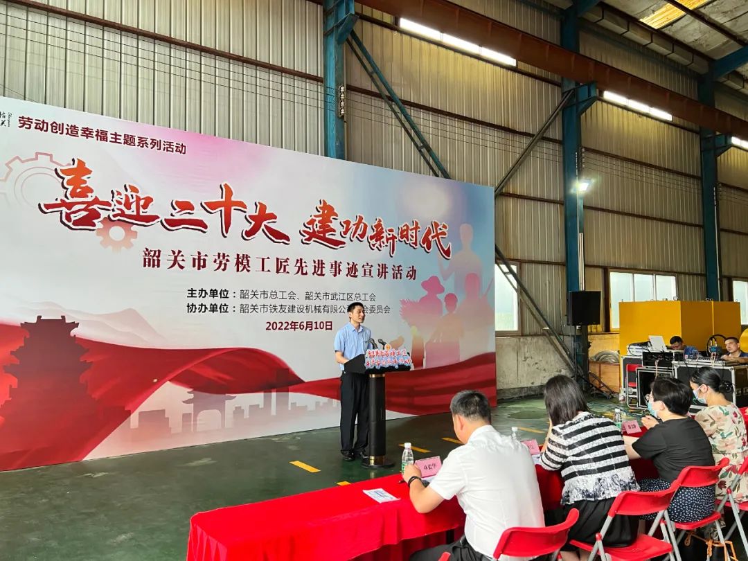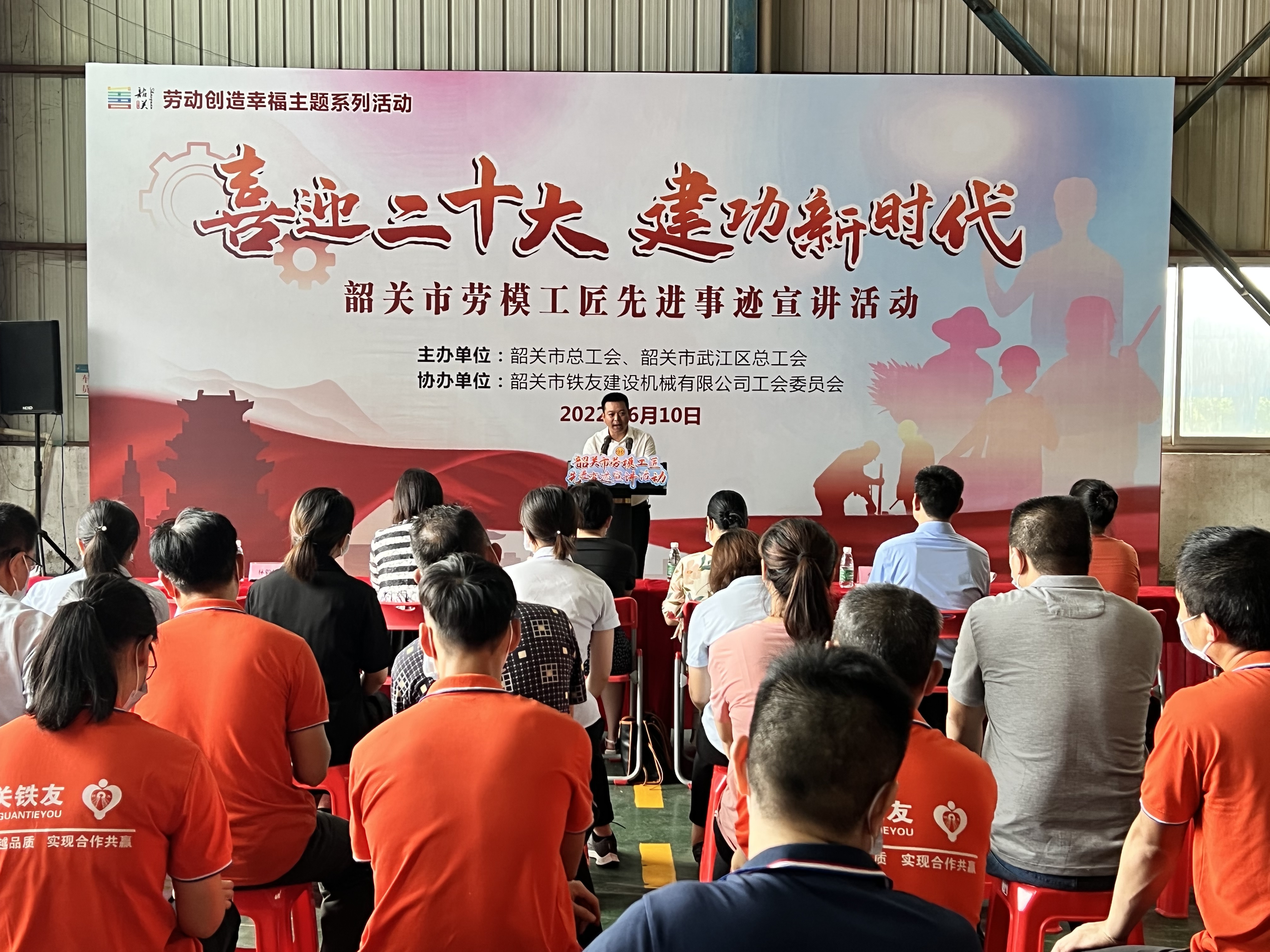 为大力弘扬劳模精神、劳动精神、工匠精神,引导广大职工群众树立“劳动创造幸福”的理念,激励职工坚定不移听党话、跟党走,帮助职工学习了解新《工会法》,维护职工的合法权益,6月10日,韶关市总工会联合武江区总工会在韶关市铁友建设机械有限公司开展“喜迎二十大 建功新时代”劳模宣讲进企业暨新修订《工会法》宣传活动。