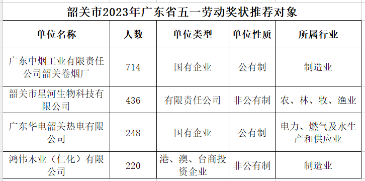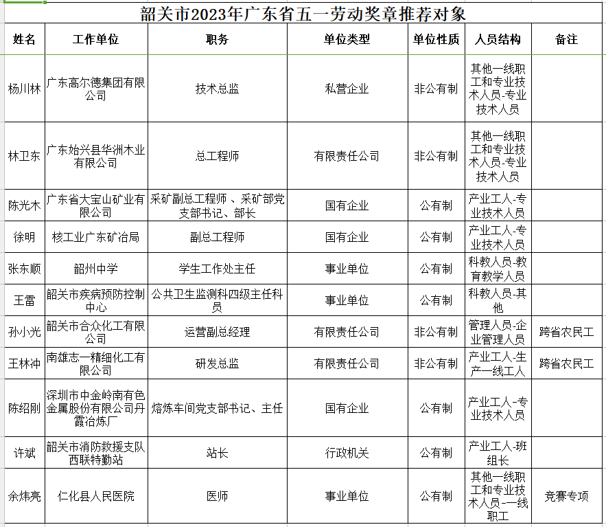 关于韶关市2023年广东省五一劳动奖推荐对象的公示