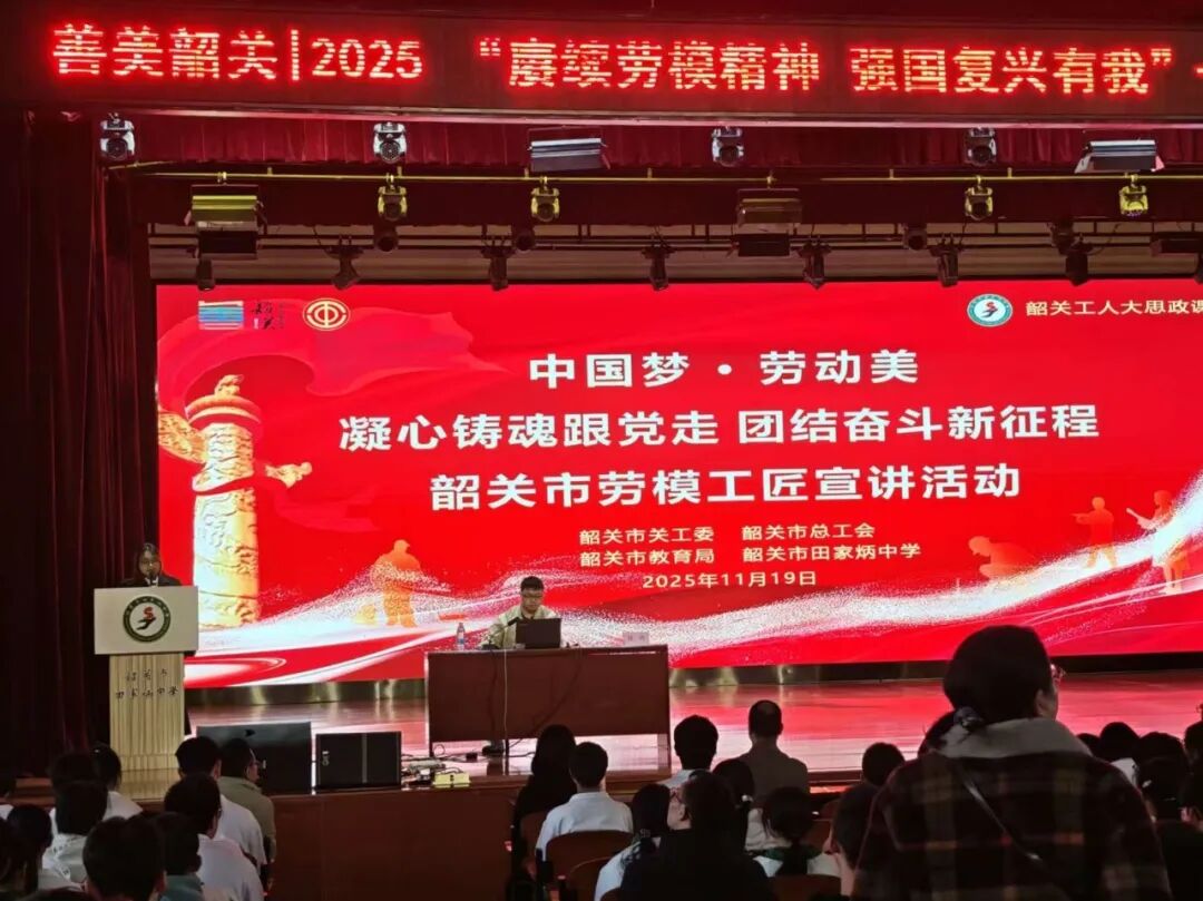 本次活动是韶关市“中国梦·劳动美”劳模工匠进校园的专场,由市关工委、市总工会等部门联合主办,田家炳中学高一年级全体学生全程参与。据介绍,张伟既是刚跻身全国首届“大国工匠”名单的高技能人才(2024年7月作为全国机械冶金建材工会唯一有色行业人选入选培育对象,经一年研修攻关成功当选),也是同学们眼中“能把车间故事讲得生动”的“工匠学长”。