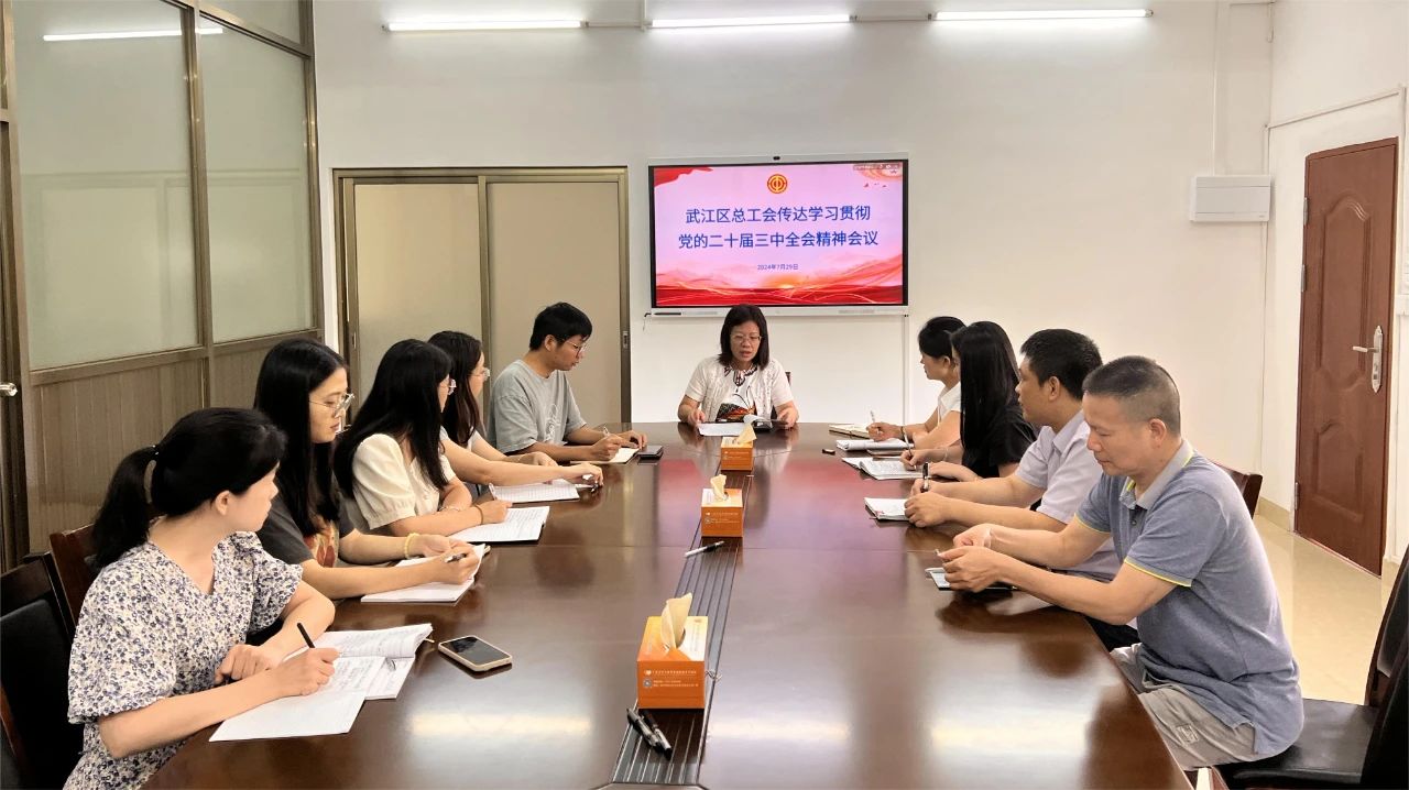 7月29日,武江区总工会召开专题会议,组织干部职工传达学习贯彻党的二十届三中全会精神以及省、市、区委学习贯彻干部大会精神和省总工会相关会议精神,并结合工会工作实际,对学习宣传贯彻党的二十届三中全会精神进行动员部署、推动落实。武江区总工会常务副主席龚耿岚主持会议。